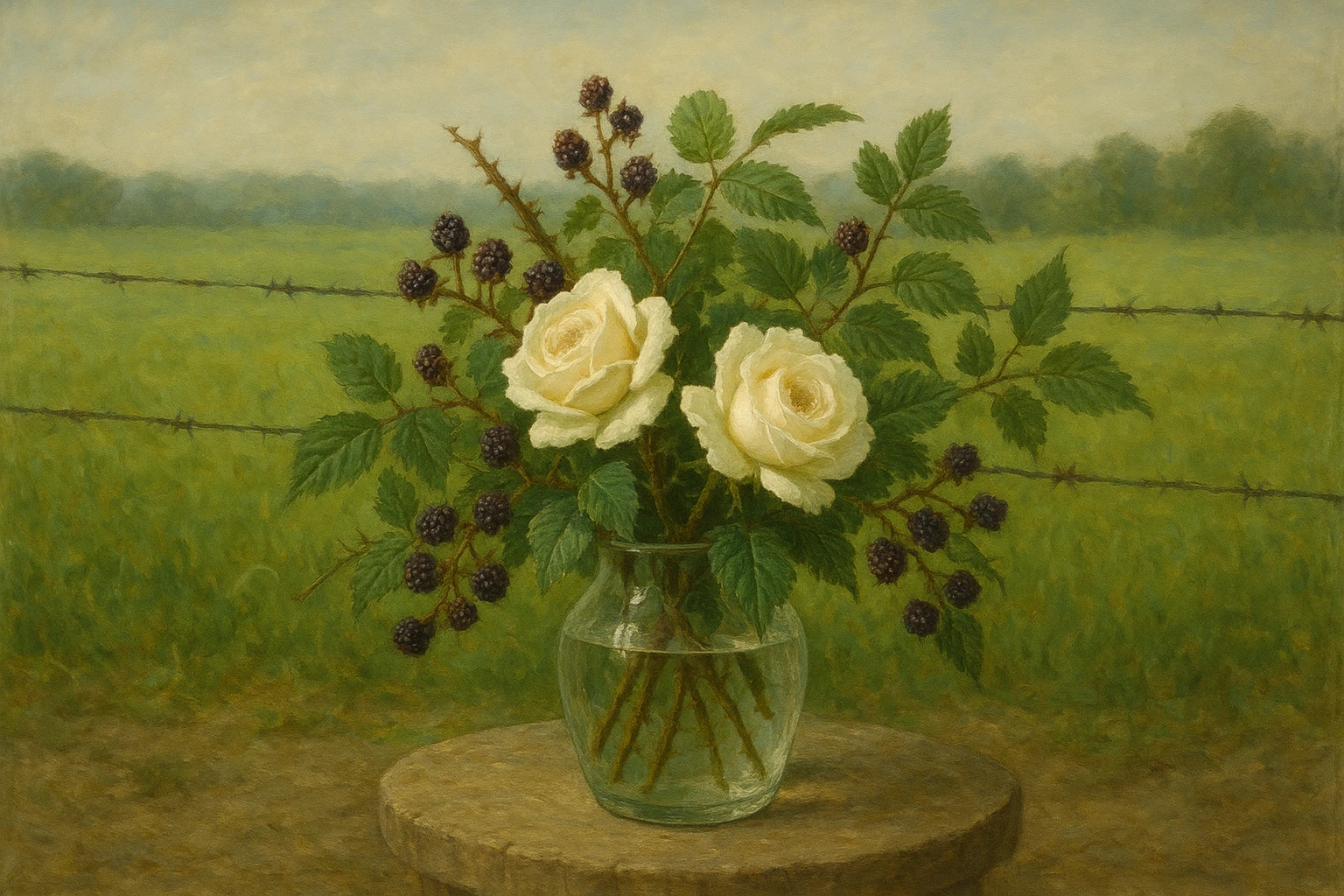 C'est une illustration banale, un morceau de campagne. Rien de particulier apparemment. En y regardant de plus près on observe les piquots de la clôture, sorte de fermeture à la vie. Dans le bouquet on découvre les ronces piquantes, les roses aux tiges sournoises. Et les orties aussi. Tout cela, dans une discrétion apparente, me fait penser à la fibromyalgie, invisible certes mais et cependant fatalement douloureuse. Et plus !